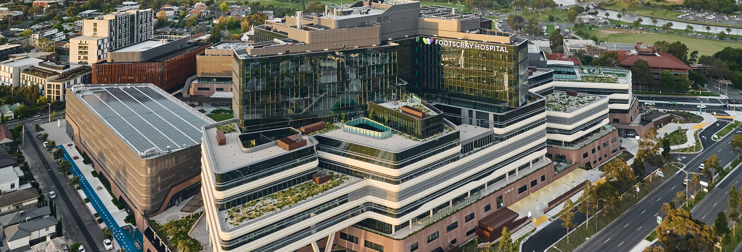 Designed as a campus rather than a single structure, the new Footscray Hospital is organised around five interconnected buildings and a central village green.